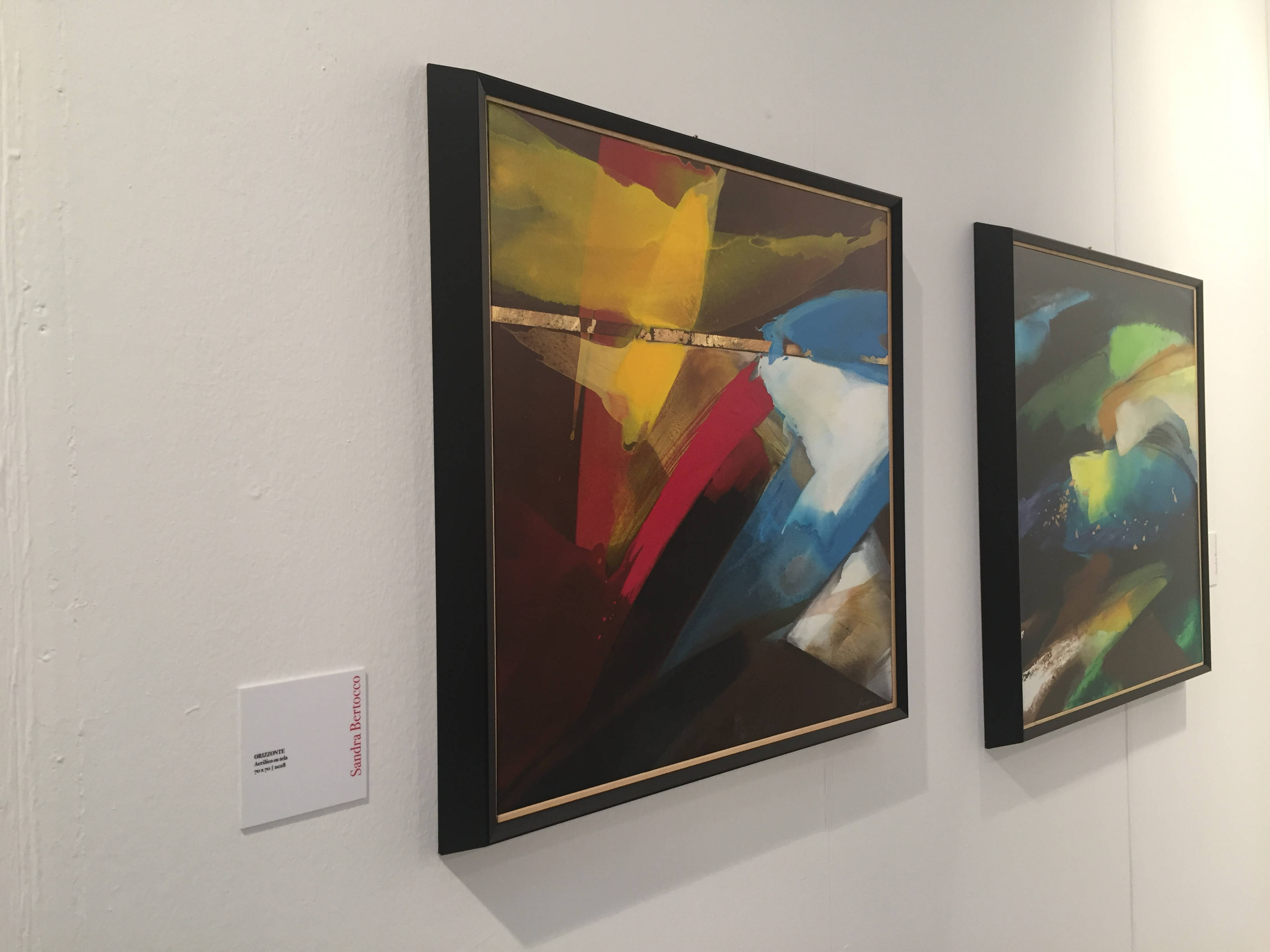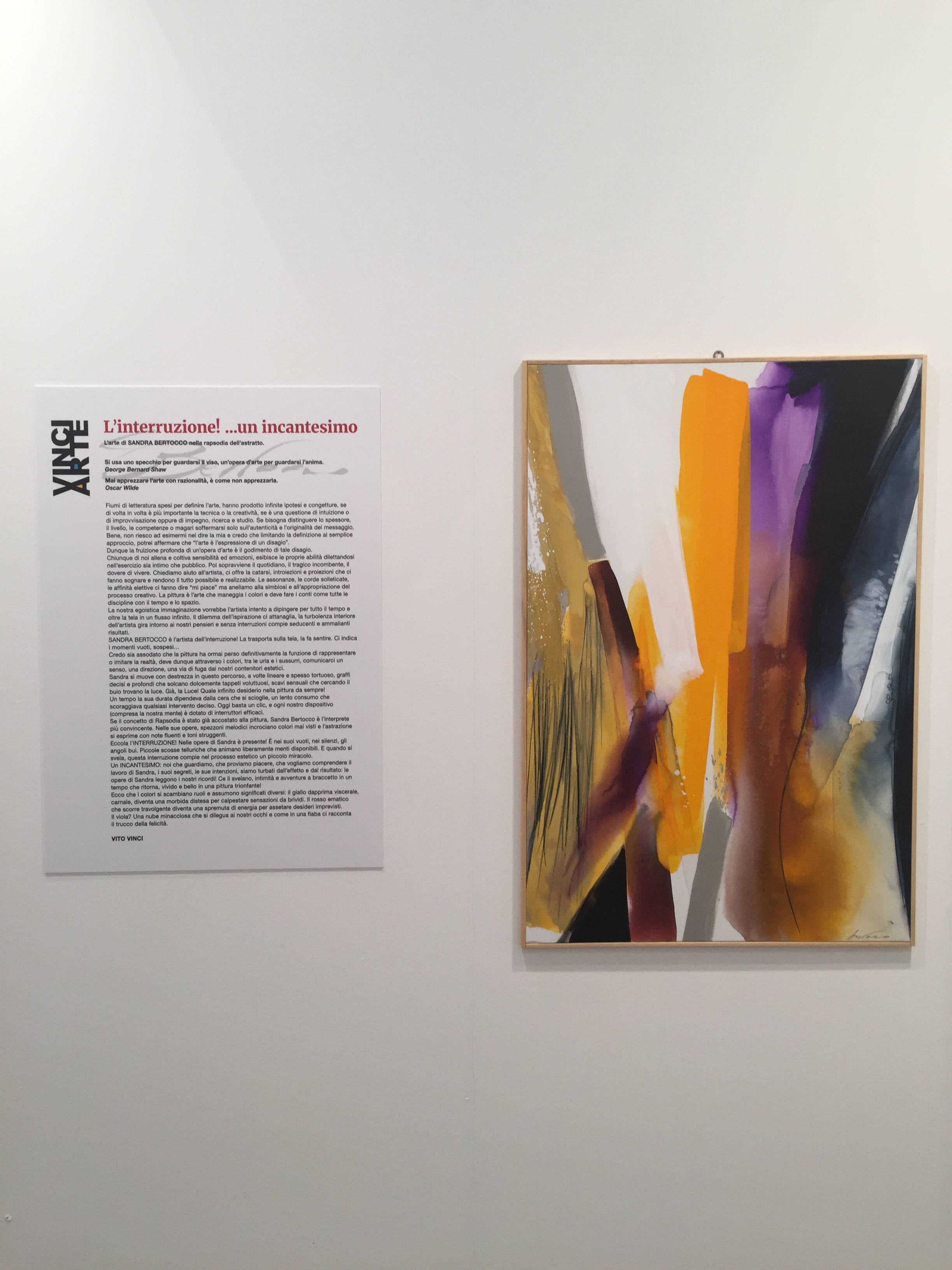 Fiumi di letteratura spesi per definire l'arte, hanno prodotto infinite ipotesi e congetture, se di volta in volta è più importante la tecnica o la creatività, se è una questione di intuizione o di improvvisazione oppure di impegno, ricerca e studio. Se bisogna distinguere lo spessore, il livello, le competenze o magari soffermarsi solo sull'autenticità e l'originalità del messaggio. Bene, non riesco ad esimermi nel dire la mia e credo che limitando la definizione al semplice approccio, potrei dire che "l'arte è l'espressione di un disagio". Dunque la fruizione profonda di un'opera d'arte è il godimento di tale disagio. Chiunque di noi allena e coltiva sensibilità ed emozioni, esibisce le proprie abilità dilettandosi nell'esercizio sia intimo che pubblico. Poi sopravviene il quotidiano, il tragico incombente, il dovere di vivere. Chiediamo aiuto all'artista, ci offre la catarsi, introiezioni e proiezioni che ci fanno sognare e rendono il tutto possibile e realizzabile. Le assonanze, le corde solleticate, le affinità elettive ci fanno dire "mi piace" ma aneliamo alla simbiosi e all'appropriazione del processo creativo. La pittura è l'arte che maneggia i colori e deve fare i conti come tutte le discipline con il tempo e lo spazio. La nostra egoistica immaginazione vorrebbe l'artista intento a dipingere per tutto il tempo e oltre la tela in un flusso infinito. Il dilemma dell’ispirazione ci attanaglia, la turbolenza interiore dell’artista gira intorno ai nostri pensieri e senza interruzioni compie seducenti e ammalianti risultati. SANDRA BERTOCCO è l'artista dell'interruzione! La trasporta sulla tela, la fa sentire. Ci indica i momenti vuoti, sospesi... credo sia assodato che la pittura ha ormai perso definitivamente la funzione di rappresentare o imitare la realtà, deve dunque attraverso i colori, tra le urla e i sussurri, comunicarci un senso, una direzione, una via di fuga dai nostri contenitori estetici. Sandra si muove con destrezza in questo percorso, a volte lineare e spesso tortuoso, graffi decisi e profondi che solcano dolcemente tappeti voluttuosi, scavi sensuali che cercando il buio trovano la luce. Già, la Luce! Quale infinito desiderio nella pittura da sempre! Un tempo la sua durata dipendeva dalla cera che si scioglie, un lento consumo che scoraggiava qualsiasi intervento deciso. Oggi basta un click, e ogni nostro dispositivo (compresa la nostra mente) è dotato di interruttori efficaci. Se il concetto di Rapsodia è stato già accostato alla pittura, Sandra Bertocco è l'interprete più convincente. Nelle sue opere, spezzoni melodici incrociano colori mai visti e l'astrazione si esprime con note fluenti e toni struggenti. Eccola l’INTERRUZIONE! Nelle opere di Sandra è presente! È nei suoi vuoti, nei silenzi, gli angoli bui. Piccole scosse telluriche che animano liberamente menti disponibili. E quando si svela, questa interruzione compie nel processo estetico un piccolo miracolo. UN INCANTESIMO: noi che guardiamo, che proviamo piacere, che vogliamo comprendere il lavoro di Sandra, i suoi segreti, le sue intenzioni, siamo turbati dall'effetto e dal risultato: le opere di Sandra leggono i nostri ricordi! Ce li svelano, intimità e avventure a braccetto in un tempo che ritorna, vivido e bello in una pittura trionfante! Ecco che i colori si scambiano ruoli e assumono significati diversi: il giallo dapprima viscerale, carnale, diventa una morbida distesa per calpestare sensazioni da brividi. Il rosso ematico che scorre travolgente diventa una spremuta di energia per assetare desideri imprevisti. Il viola? Una nuvola minacciosa che si dilegua ai nostri occhi e come in una fiaba ci racconta il trucco della felicità.